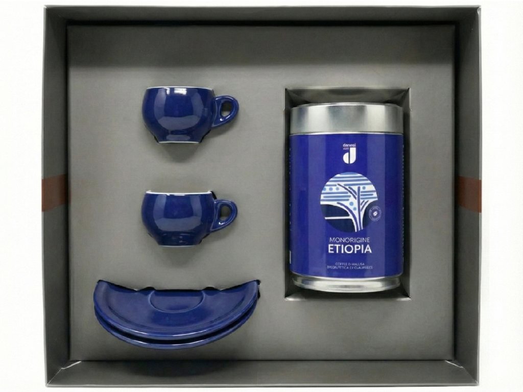 Danesi Duo Plus Set Blue Etiopia Grain – Dunkle Kaffeebohnenkassette 250 g + 2 Tassen und 2 Untertassen – blau