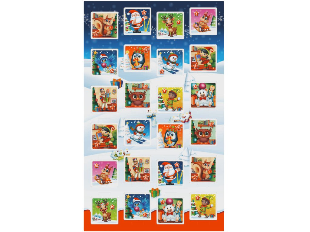 Verkürzen Sie sich die Wartezeit auf den Weihnachtsmann mit dem Kinder-Adventskalender! Jeden Tag erwartet Sie eine beliebte Schokoladenleckerei, vom Überraschungsei bis zum leckeren Schoko-Bon. Und das Beste daran? Der Spaß ist nach dem Verzehr der Leckereien noch lange nicht vorbei! Die Kalenderhülle lässt sich ganz einfach in ein lustiges Memo-Spiel für die ganze Familie verwandeln. Ein ideales Geschenk, das doppelt Freude macht.